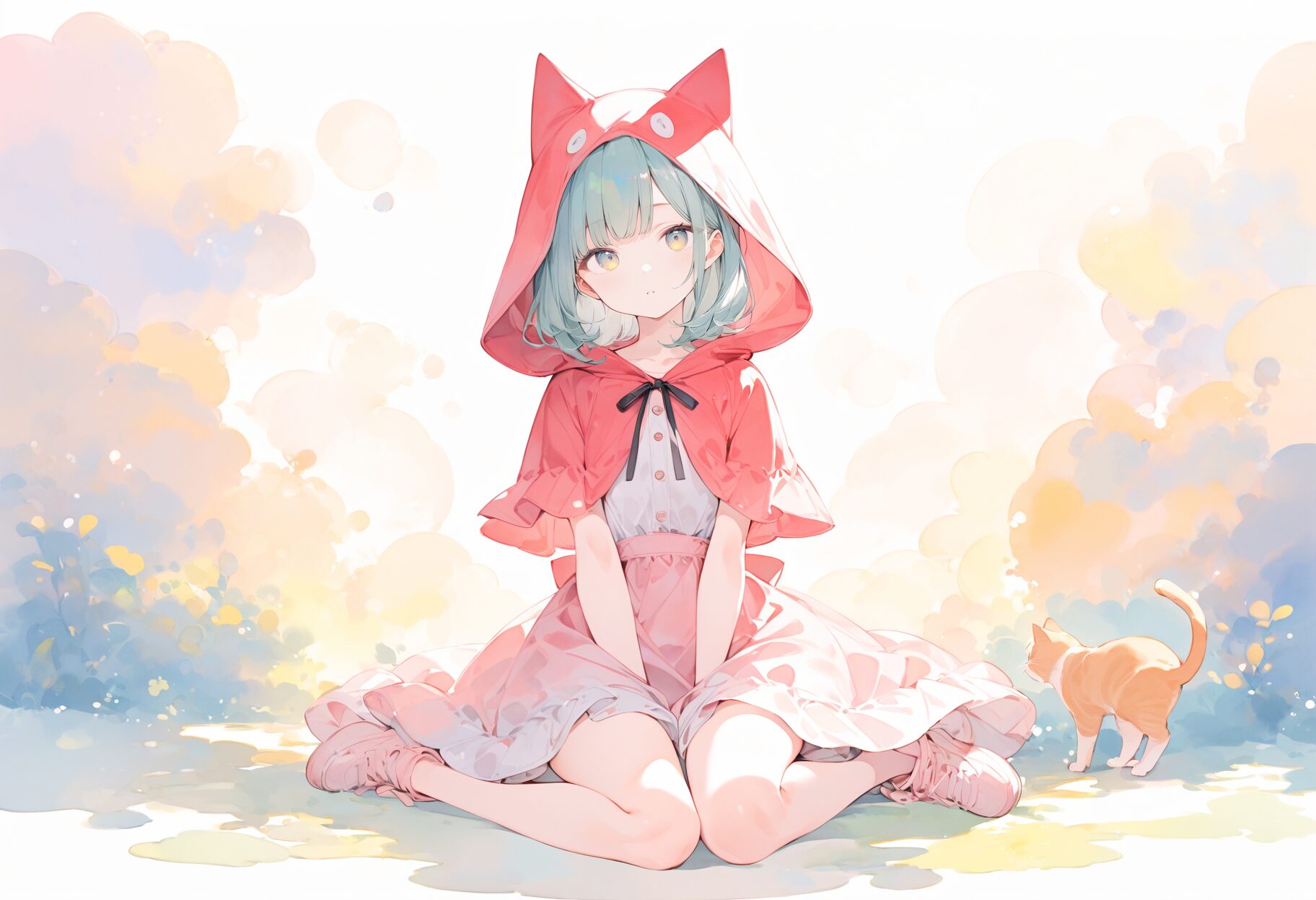 masterpiece, best quality, highres, ultra-detailed, 8k resolution, 1girl, cute, twin tails, watercolor, shy, crossed arms, bob cut, pink hair, detailed hair, pastel colors background, flower petals floating, warm light, cherry blossoms, color washと依頼してみると