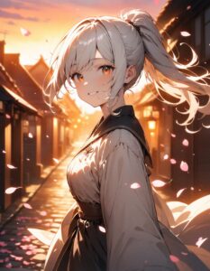 masterpiece, best quality, highres, ultra-detailed, 8k resolution, 1girl, cute, smooth skin, watercolor, gentle smile, spinning, ponytail, white hair, wind-swept hair, sunset background, old cobblestone street, natural lighting, cherry blossoms, glow
