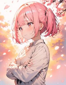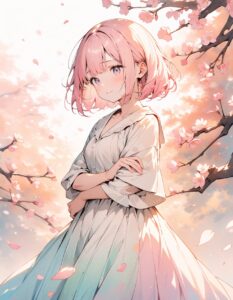 "Masterpiece, best quality, ultra-high resolution, highly detailed, 8k resolution, a cute shy girl with twin tails and a bob cut, soft pink hair with intricate details, standing with her arms crossed, in a gentle watercolor style. The background features a dreamy pastel color palette with flower petals floating gracefully in the warm, golden light. Cherry blossoms are scattered around, enhancing the serene atmosphere. The image has a delicate color wash, giving it a soft, ethereal feel."こんな感じで出力されます。