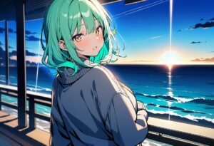 2. その他の詳細を追加します。例えば、「green hair, sweater, looking at viewer, outdoors, ocean, night」と記述します。
