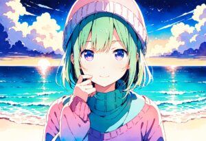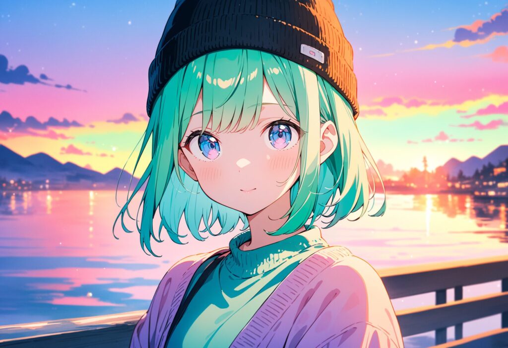 1girl, anime, anime, face focus, green hair, sweater, looking at viewer, upper body, beanie, outdoors, ocean night,