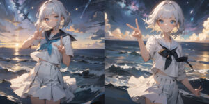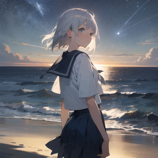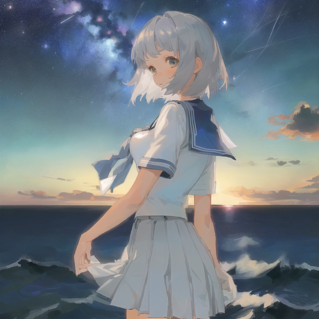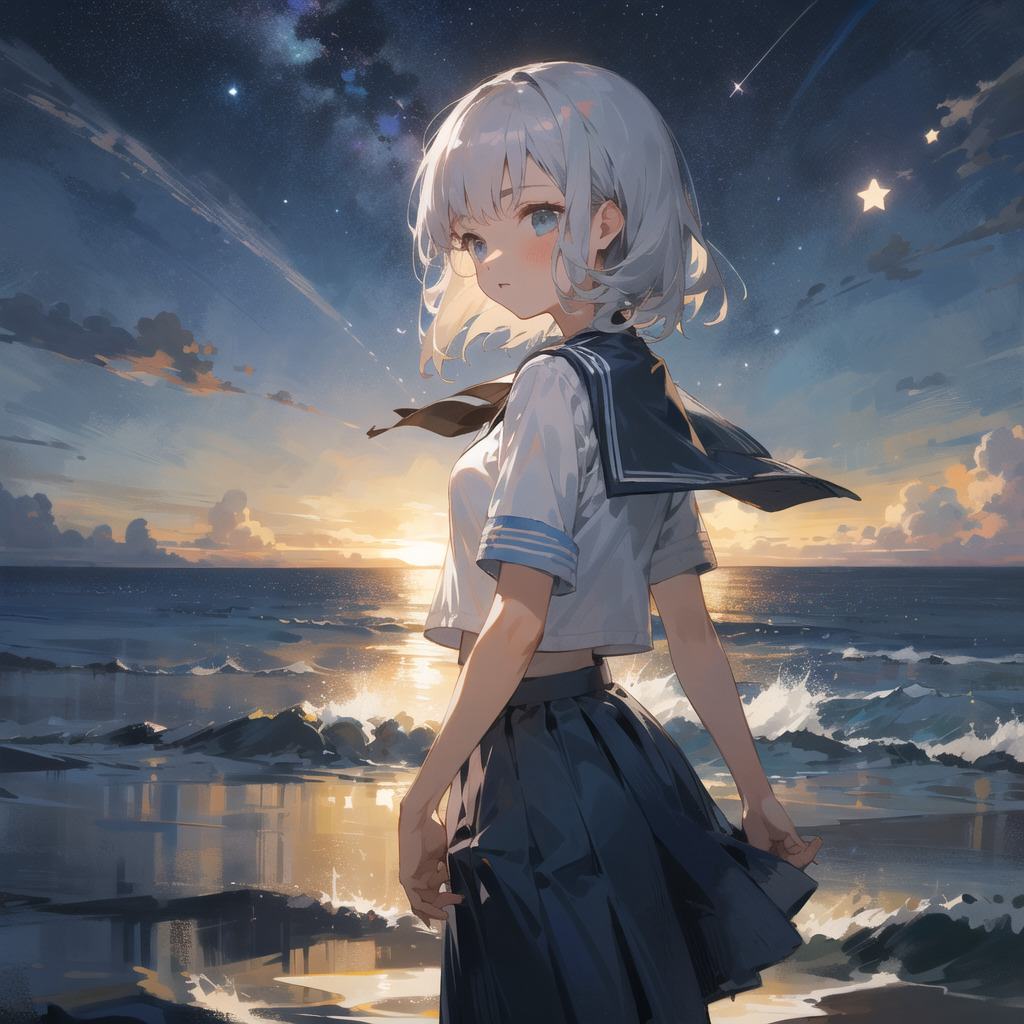 (best quality:1.2),1girl,medium cut,silver hair,high school sailor uniform,cowboy shot,looking back,ocean,starry sky