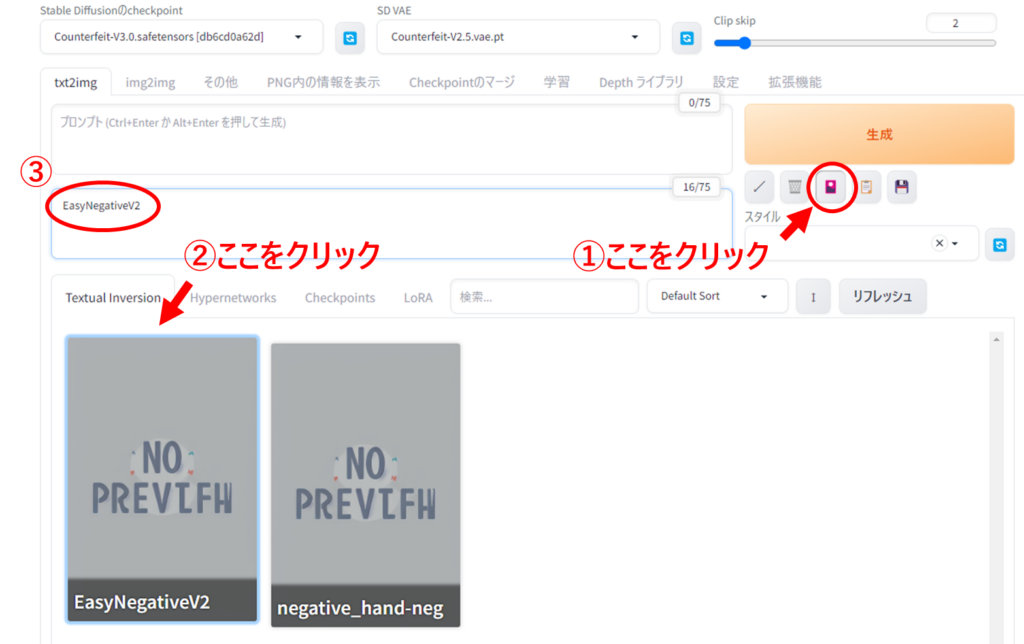 ネガティブプロンプトの欄に「EasyNegativeV2」と入力されたのが確認できれば完了です。
