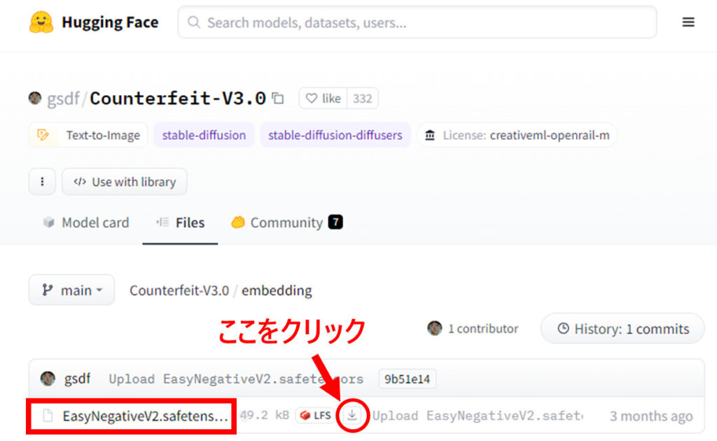 「EasyNegativeV2.safetensors」をダウンロードします。
