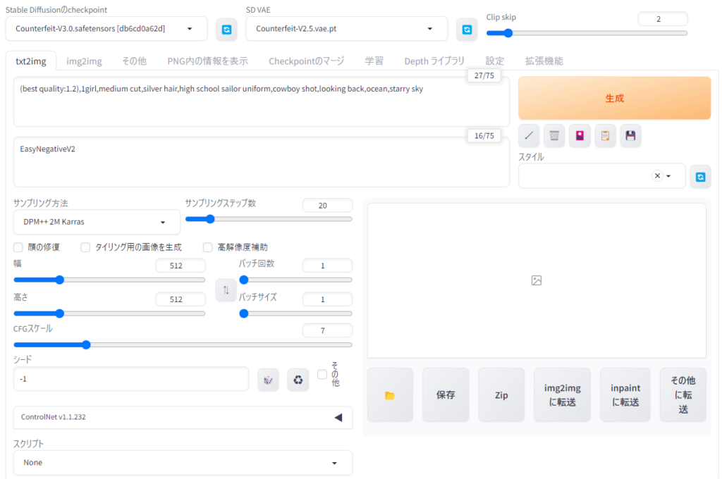 EasyNegative2をネガティブプロンプトに記載したら、あとはいつもどおりプロンプトに入力して、生成ボタンを押すだけ。