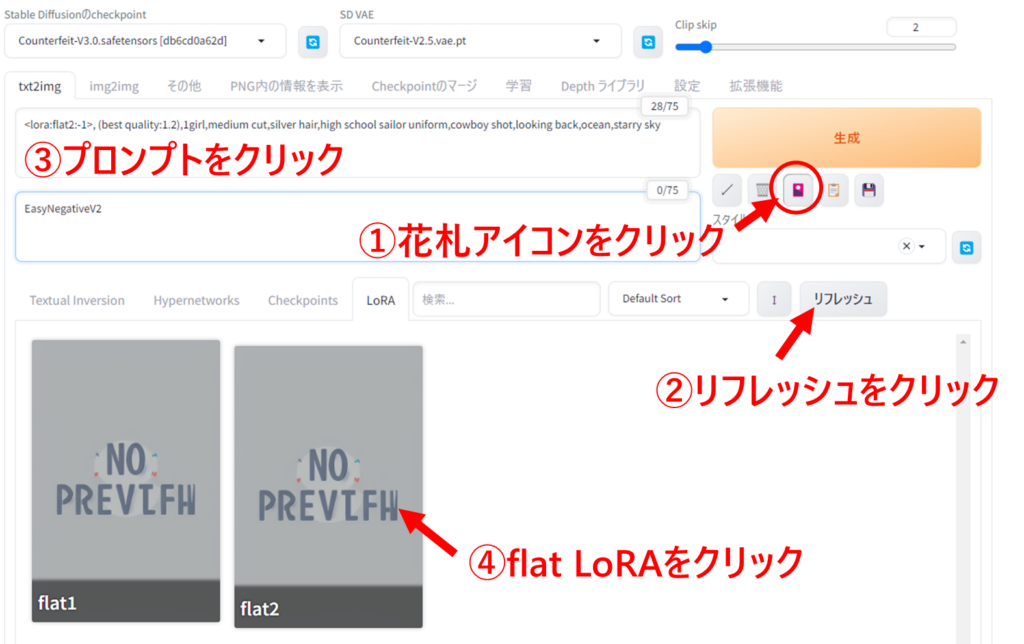 プロンプトをクリックしたら、使いたいflat LoRAをクリックします。