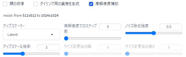 Hires.fix(高解像度補助)にチェックを入れると、項目が追加されます。