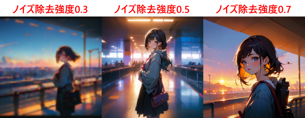ノイズ除去強度は、もとの低解像度の画像からどの程度ノイズを除去するか、という指標。