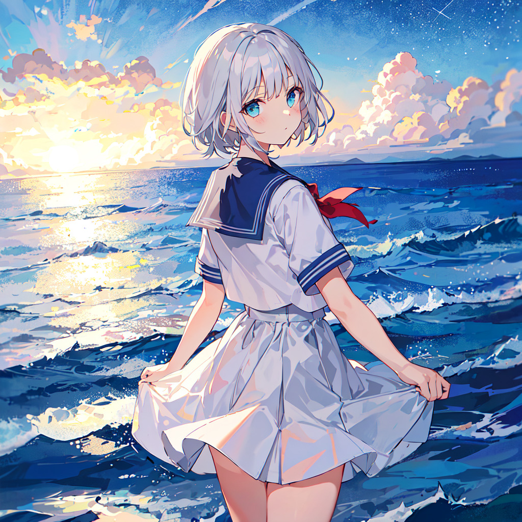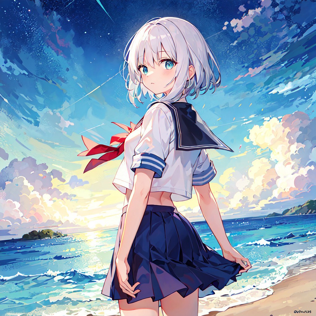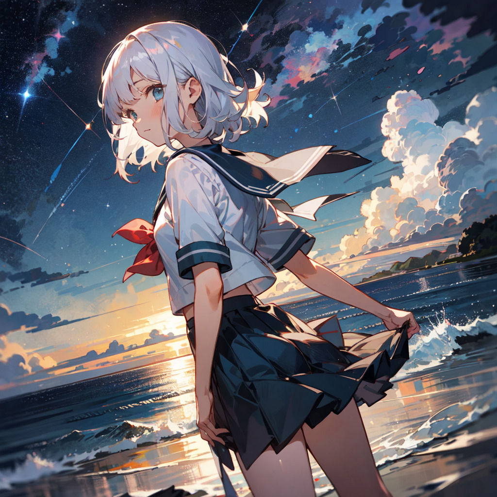 (best quality:1.2),1girl,medium cut,silver hair,high school sailor uniform,cowboy shot,looking back,ocean,starry sky