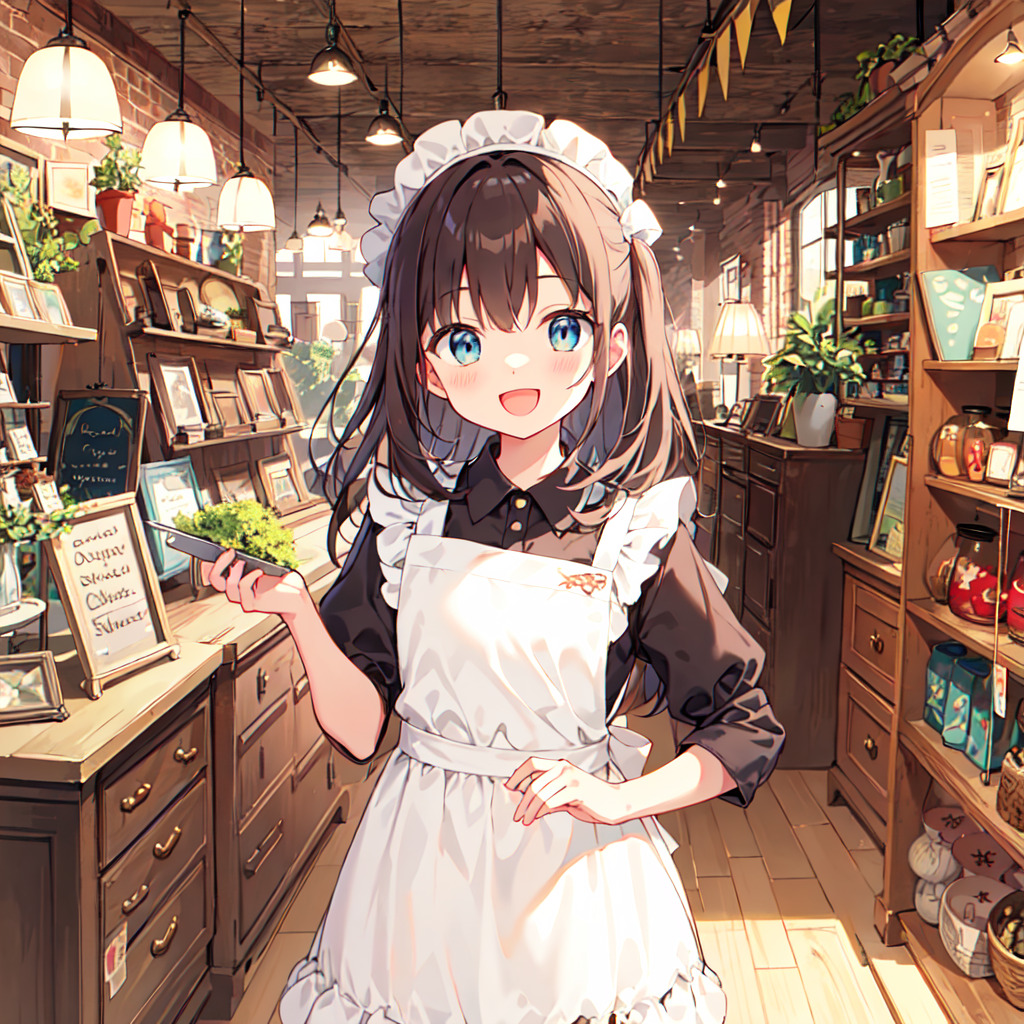 cute girl,indoors,antique shop,many antique goods,shop counter,display shelf,apron,happy smile,perspectivecute girl: 生成される画像は、可愛らしい女の子のシーンであることを指示しています。indoors: 生成される画像のシーンは室内であることを指示しています。antique shop: 生成される画像の背景はアンティークショップであることを指示しています。many antique goods: 生成される画像には多くのアンティーク品が描かれていることを指示しています。shop counter: 生成される画像には店のカウンターが描かれていることを指示しています。display shelf: 生成される画像にはディスプレイ棚が描かれていることを指示しています。apron: 生成されるキャラクターはエプロンを着用していることを指示しています。happy smile: 生成されるキャラクターは幸せそうに笑っていることを指示しています。perspective: 生成される画像は特定の視点から描かれていることを指示しています。