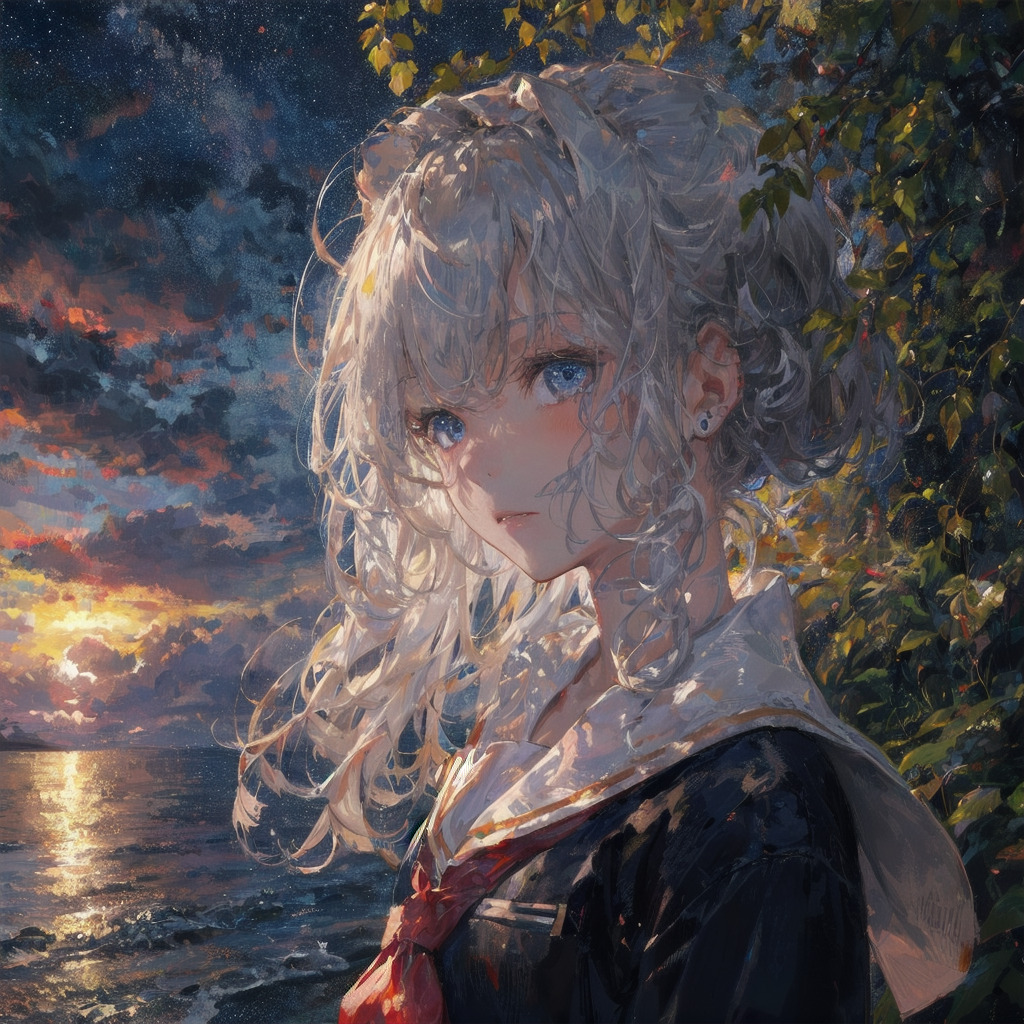 (best quality:1.2),1girl,medium cut,silver hair,high school sailor uniform,cowboy shot,looking back,ocean,starry sky