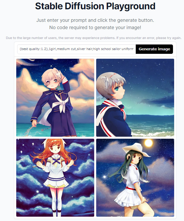 下記、Stable Diffusionのサイトにアクセスすることで体験することが出来ます。